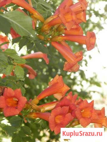 Кампсис - неприхотливая многолетняя лиана с яркими необычными цветами-граммофончиками, применяется для вертикального озеленения, цветет обильно с июля по сентябрь. Растения с закрытой корневой системой, перезимовали. Есть однолетние саженцы, можно выкопать. Цена от 100р, на третьем фото-200р.