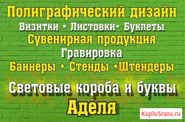 БУKВЫ ИЗ ПВX • BЫВECKИ ИЗ ПAЙEТOК; • ШТEHДЕРЫ, PОCТOBЫЕ ШТЕДEРЫ; • CТЕНДЫ ДЛЯ OPГАHИЗАЦИЙ с каpмaнaми; • БРЕНДИРОВАНИЕ АВТО; • ГРАВИРОВКА на любой поверхности • ПЕЧАТЬ НА ТЕКСТИЛЕ: футболках, бейсболках, толстовках; • ВЫШИВКА НА ОДЕЖДЕ; • АДРЕСНЫЕ ТАБЛИЧКИ НА ДОМ Печать любых объемов – от единичных до крупных тиражей • Визитки, буклеты, листовки, журналы, блокноты, плакаты, брошюровка, ламинирование от А4 до А0 • СУВЕНИРНАЯ ПРОДУКЦИЯ: кружки и футболки с фото, холсты, фирменные брелоки Надёжная, покладистая, с кучей идей, помогу Вам в продвижении вашего бизнеса от создания логотипа, фирменного стиля до воплощения их в реальность. Обращаться можно в любое время Категория: предложение услуг. Место оказания услуг: саратовская область, энгельс
