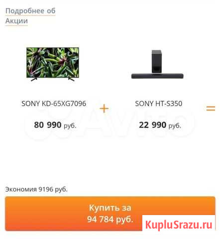 Телевизор sony 65xg7096 + саундбар sony ht-s350 75 000 руб.