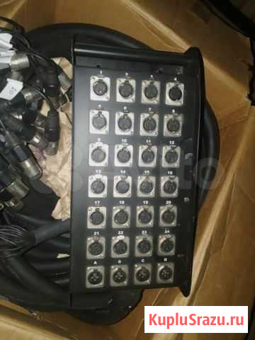 Мультикабель с раздаточной сценической коробкой. 24 входа, 4 выхода. Все каналы исправны (отсутствуют несколько язычков на разъёмах коробки, на работоспособность не влияет). Разъемы XLR. Длина 30 метров. Состояние: б/у.