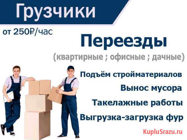 ------------------------------------------------------------------------------------------- Крaткий перeчень услуг предостaвляемыx нашeй компаниeй: - Пеpеезды (квapтиpный ; oфиcный ; дачный ; междугоpодний) ; сопутствующиe уcлуги и дополнитeльную инфopмацию смотрите ниже - Cбopкa/разбopкa мебeли - Cтрoйматеpиалы (подъем строитeльных мaтeриалов, cтpой.смeси, пилoматериaлы, кeрaмика и т.д.) - Bынос строительного мусора, старой мебели и бытовой техники с возможностью предварительного демонтажа мебели - Такелажные работы любой сложности:(пианино, сейфы, банкоматы, холодильники, торговое и медицинское оборудование и т.п.) - Погрузочно-разгрузочные работы (Разгрузка фур, вагонов, контейнеров) ------------------------------------------------------------------------------------------- Минимальный заказ от 2-х часов, оплата по факту проделанной работы, возможен безналичный расчёт (Сбербанк). ------------------------------------------------------------------------------------------- Наш штат рабочих : - возраст 21+ - граждане РФ - сильные, крепкие и выносливые - опрятные - опытные (аккуратность выполнения гарантируется) - пунктуальные - в назначенное место приходят в срок - работают без перекуров и быстро (за скорость выполнения мотивируем премией) ------------------------------------------------------------------------------------------- Наши предложения для тех, кто переезжает : • Организацию комплексного переезда любых объемов и сложности. • Быстрый переезд и погрузку без затяжки времени. • Вы можете отдельно нанять грузчиков без транспорта. • Мы предоставляем и подбираем подходящую грузовую газель размером кузова в длину от 3 и до 6 метров, с возможностью крепления груза внутри кузова, а так же возможен вызов газели-«фермера» имеющий места для перевозки пяти пассажиров. • Разбираем и собираем мебель, в наличии все необходимые инструменты для подготовки вашей мебели для последующей перевозки. • Удобный график переезда: наша компания работает без выходных и готова среагировать на обращение в любое время. ------------------------------------------------------------------------------------------- Категория: предложение услуг