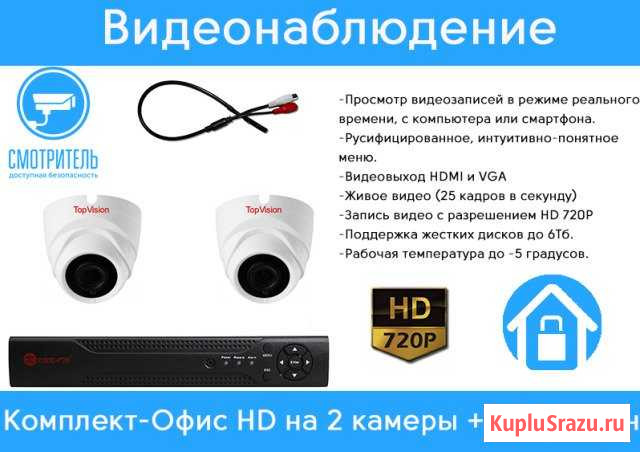 Комплект из двух внутренних видеокамер формата HD 720p (1280x720), для построения системы видеонаблюдения, на базе четырех канального регистратора (возможность расширения системы до 4 камер).  Камеры купольного исполнения для удобного монтажа на горизонтальную поверхность. Микрофон повышенной чувствительности.  Камеры оснащены SMD светодиоды, которые позволяют детально рассмотреть объекты в темное время суток. Индивидуальный подход к каждому клиенту, скидки на монтажные работы. ЗВОНИТЕ, мы соберем комплект под вашу задачу. Мы работаем на рынке более 5 лет, у нас огромный опыт по обеспечению безопасности любых объектов, от частного дома/дачи/коттеджа, до промышленных сооружений и торговых центров. Гарантия 2 года. Все оборудование в наличии. Возможен монтаж в течении суток.   Категория: аудио и видео