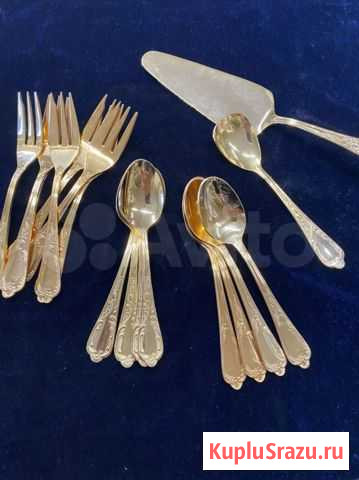 Solingen Germany ??. Вторая половина 20 века. Позолота 23/24 К и нержавеющая сталь Цена за ложечку для сахара 400?, лопатка для торта 1000?, набор 6 чайных ложек и 6 десертных вилочек 4000?. При покупке нескольких предметов - скидка. Состояние: новое.