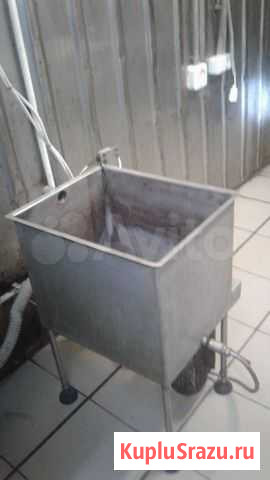 Ошпарочная ванна для термической обработки птицы. Мощность 3 кВт из нержавеющей пищевой стали с терморегулятором.Имеется эл.двигатель с крыльчаткой для перемешивания воды. Емкость 60л. Размеры 60х60х40 см. Состояние: б/у.