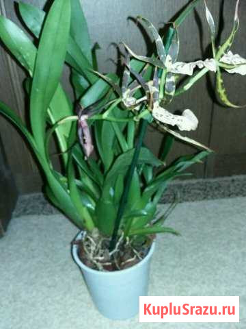 Цветущая орхидея брассия с двумя нераскрытыми цветоносами. Корневая отличная, очень много бульб. Пересажена в крупную кору лиственницы. Вид объявления: продаю своё. Место сделки: мытищи, московская область, первомайская улица