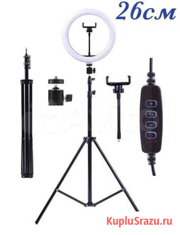 Кольцевая лампа со штативом и держателем для телефона. Максимальная высота штатива 2.1 м. Диаметр кольца 26 см- 1700р; 33см- 2500р. Состояние: новое.