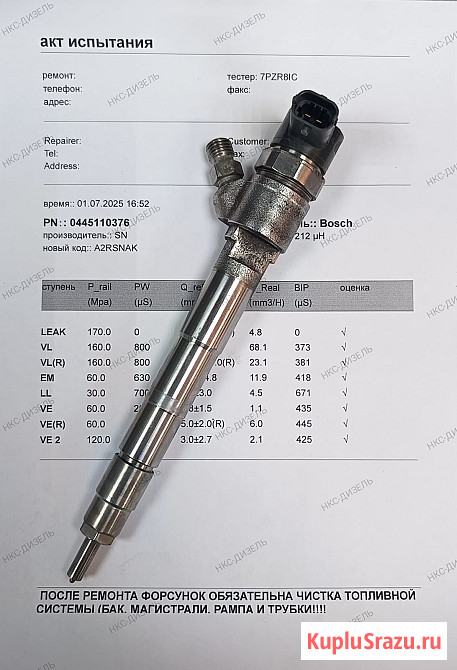 Форсунка 0445110376 восстановлена в нашей дизельной мастерской, с использованием нового клапана.