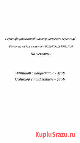 Я сертифицированный мастер ногтевого сервиса, предлагаю услугу аппаратного маникюра с покрытием гель-лака. Запись по телефону,<!--noindex-->***** Другие наши услуги со скидками на сайте СтранаУслуг.ру *****<!--/noindex--> Vaber, WhatsApp. Категория: предложение услуг. Место оказания услуг:...