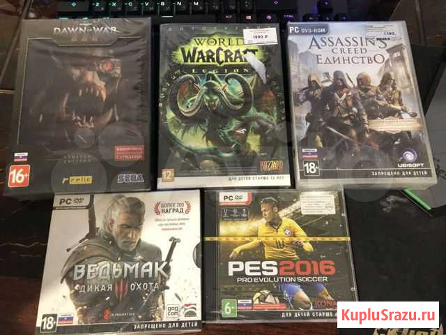 Все новые запечатанные. PRO Evolution Soccer 2016 Warhammer Dawn of War 3------------- Продан Assassins Creed Единство World of WarCraft Legion Дополнение - продан Ведьмак 3 дикая охота каждый по 500 р Состояние: новое.