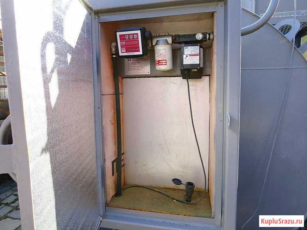 Комплектация: Топливный двустенный резервуар с комплектом технологического оборудования. Электрический насос выдачи топлива. Фильтр очистки топлива. Заправочный пистолет с рукавом 6 метров. Механический счетчик. Шкаф выдачи с дверцей. Узел наполнения на крыше люка-лаза
