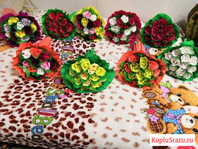 Розы ручной работы. Сделанные из гофрированной бумаги. Внутри каждой розы находится конфета. 15 роз с конфетами " Золотая лилия". Возможно исполнение в любом цвете. .Принимаю заказы каждый день! Возможна доставка. Вид объявления: продаю своё. Место сделки: москва, щербинка, люблинская улица, 5