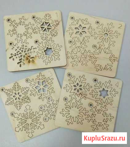Продам снежинки из фанеры. возможно для декорирования. Стоимость указана за набор. в наборе 4 шт. в наличии 10 наборов. размер квадрата 11*11 см. размер снежинок от 5,5 до 6.5 см Состояние: новое.